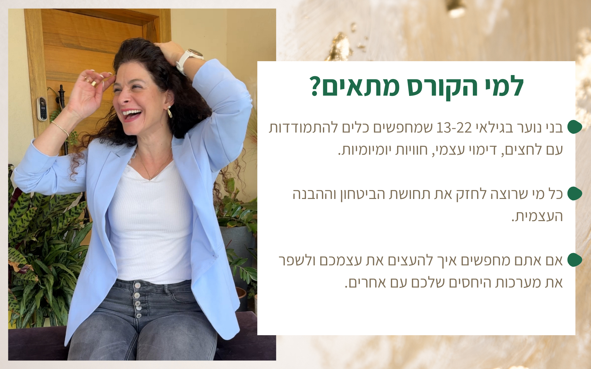 תוכלו לגלות איך לחזק את הביטחון העצמי שלכם, למצוא את הקול האמיתי שלכם, ולהתמודד עם האתגרים שהחיים מביאים לכם.